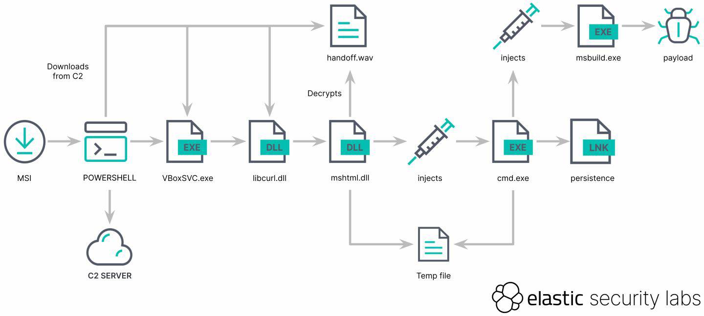 The decrypted file is a tar archive containing an executable VBoxSVC.exe which is in reality a renamed signed gup.exe executable that is used to update Notepad++, which is vulnerable to sideloading, an encrypted file in one example handoff.wav and a mostly benign library libcurl.dll with one of its functions overwritten with malicious code. The PowerShell executes the binary VBoxSVC.exe that will side load from the current directory the malicious DLL libcurl.dll.