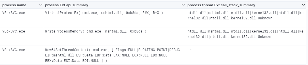 This technique is known as “module stomping”. The following image shows the associated VirtualProtect API calls captured with Elastic Defend associated with the module stomping:
