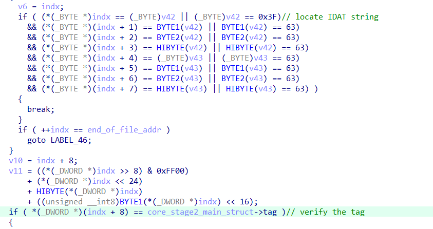 }; - size_of_chunk: The malware utilizes this value, performing bits shifting to determine the chunk size to extract before the next occurrence of IDAT.